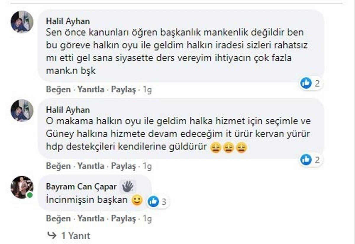 Akışık’ın sosyal medyada paylaşılan açıklamasının altına yorum yapan Ayhan; “Sen önce kanunları öğren. Başkanlık mankenlik değildir. Ben bu göreve halkın oyu ile geldim. Halkın iradesi sizleri rahatsız mı etti? Gel sana siyasette ders vereyim. İhtiyacın çok fazla manken başkan” sözleriyle karşılık vermişti.