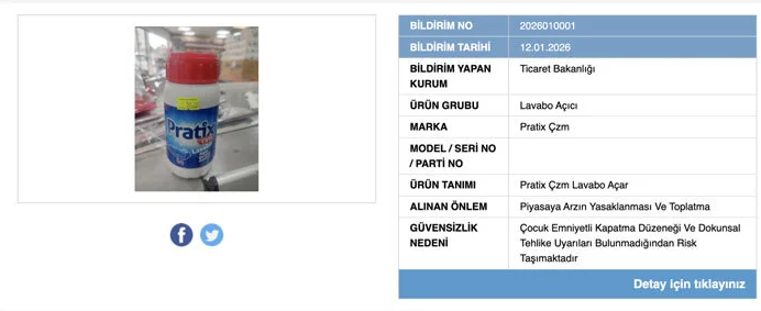 Ticaret Bakanlığı, Güvensiz Ürün Bilgi Sistemi (GÜBİS) üzerinden yaptığı duyuruda, Pratix Çzm marka lavabo açıcı için sağlık riski gerekçesiyle satış yasağı ve toplatma kararı alındığını açıkladı. Ürünün, çocuk emniyeti kapatma düzeneği ve dokunsal tehlike uyarılarının bulunmaması nedeniyle güvensiz olduğu belirtildi.