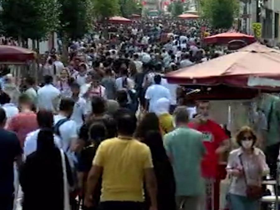 Taksim ve İstiklal Caddesi'ne gelenlerin bazıları maske takmazken, bazılarının da maskeleri koluna taktığı, bazılarının da çenesine indirdiği görüldü.