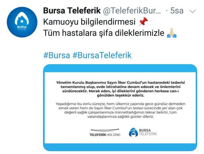 * Yaşadığımız bu zorlu süreçte, hem ülkemiz çapında gece gündüz demeden emek veren hem de Sayın İlker Cumbul'un tedavi sürecinde yer alan çok değerli sağlık çalışanlarımıza minnettarlığımızı tekrar belirtir, tüm vatandaşlarımıza sağlıklı günler dileriz.