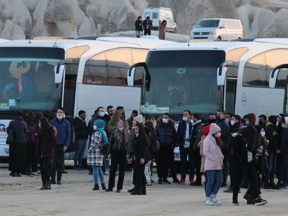 Kapadokya bölgesinde sabahın erken saatlerinde balon turlarına izlemek üzere bölgeye gelen 8 tur otobüsünde bulunan öğrenci grupları balon turlarının iptal edilmesinin ardından corona virüsü kurallarına hiçe sayarak halay çekip oyun havasında oyunlar oynaması kameralara yansıdı.