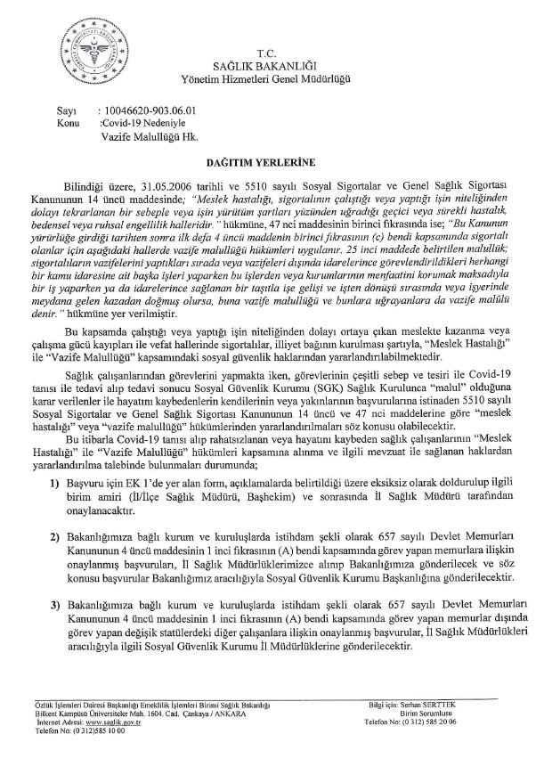 “Sağlık çalışanlarından görevlerini yapmakta iken, görevlerinin çeşitli sebep ve tesiri ile Covid-19 tanısı ile tedavi alıp tedavi sonucu SGK Sağlık Kurulunca “malul” olduğuna karar verilenler ile hayatını kaybedenlerin kendilerinin veya yakınlarının başvurularına istinaden 5510 sayılı Sosyal Sigortalar ve Genel Sağlık Sigortası Kanunu’nun 14’üncü ve 47’nci maddelerine göre “meslek hastalığı” veya “vazife malullüğü” hükümlerinden yararlandırılmaları söz konusu olabilecektir.”