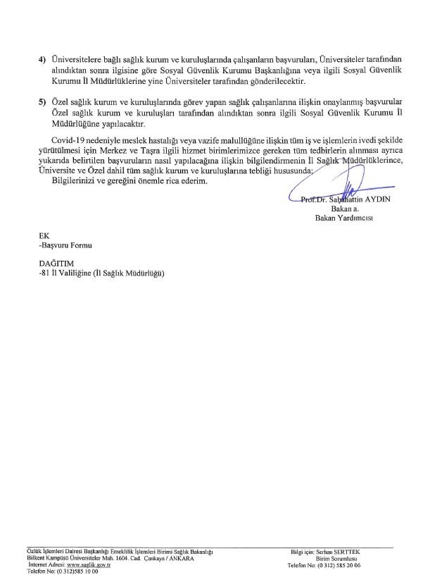 Bakan Yardımcısı Prof. Dr. Sabahattin Aydın imzalı genelgede, “Covid-19 nedeniyle meslek hastalığı veya vazife malullüğüne ilişkin tüm iş ve işlemlerin ivedi şekilde yürütülmesi için Merkez ve Taşra ilgili hizmet birimlerimizce gereken tüm tedbirlerin alınmasını önemle rica ederim” denildi.