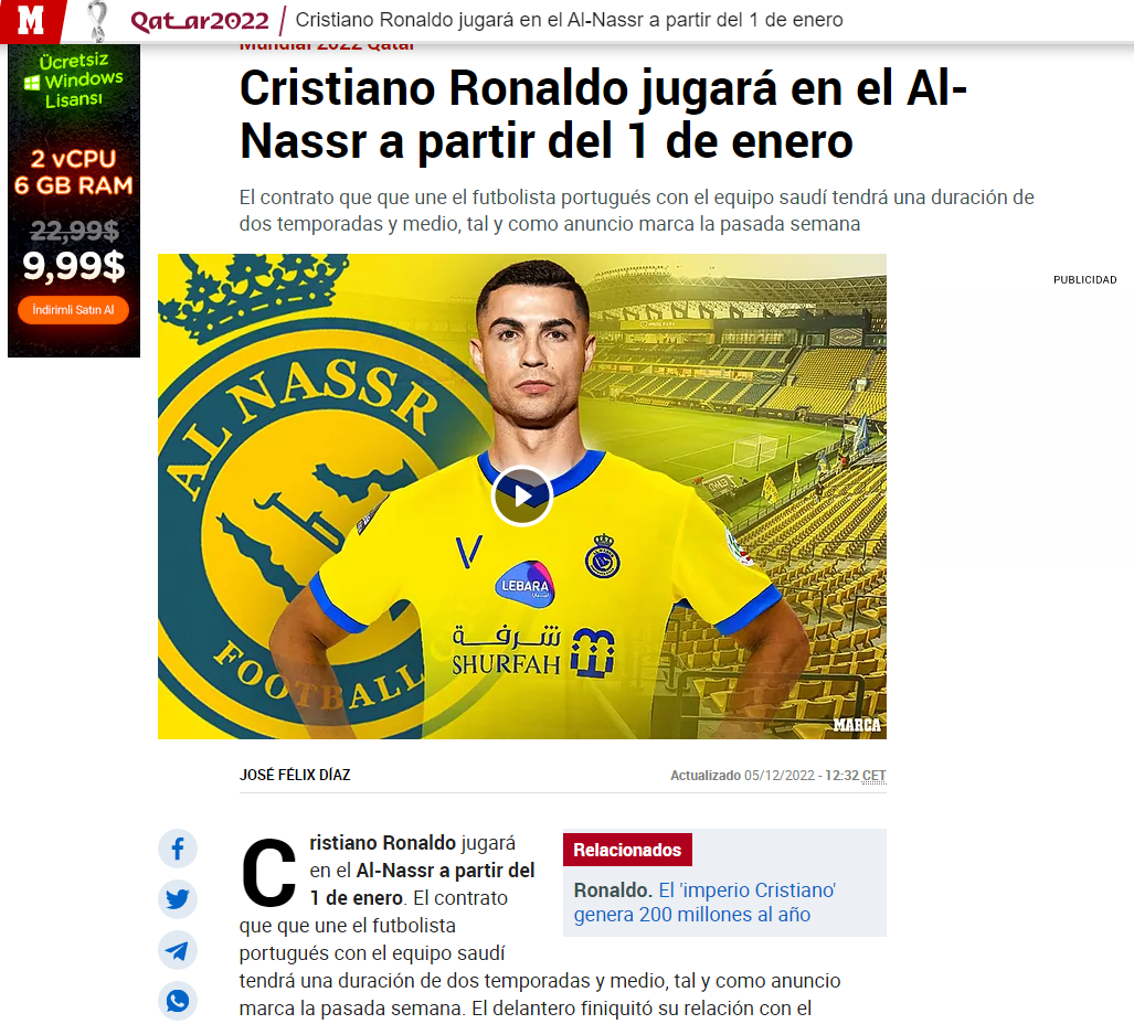 İspanya'nın önde gelen gazetesi Marca, Cristiano Ronaldo'nun 1 Ocak'tan itibaren Suudi ekibinin formasını giyeceğini ve sözleşmenin 2,5 yıllık olduğunu yazdı. Katar'daki Dünya Kupası başlamadan kısa süre önce Manchester United ile bütün ipleri kopartan Ronaldo'nun, kulüp ve Teknik Direktör Erik ten Hag hakkındaki açıklamaları sonrası İngiliz ekibindeki sözleşmesi feshedildi.