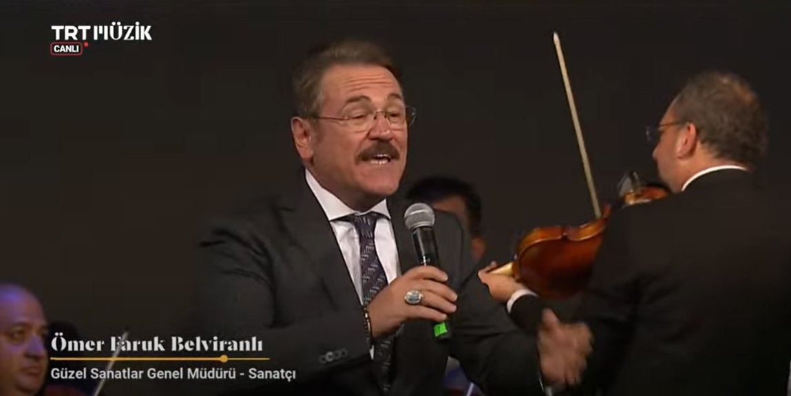 Yazının altında imzası bulunan Güzel Sanatlar Genel Müdürü Ömer Faruk Belviranlı da dün bir şarkı seslendirdi. Acele talimatla, zorunlu olarak salona getirdiği orkestra ve koro sanatçılarıyla "Muhabbet bağına girdik bu gece" şarkısını söyledi. Belviranlı, İmam Hatip Lisesi'ni bitirkten sonraHafız Ahmet Kirdiş'ten tasavvuf musikisi, Hafız Hasan Hüseyin Varol'dan Kuran talimi dersleri aldı. Bu arada Anadolu Üniversitesi İşletme Fakültesini bitirdi.