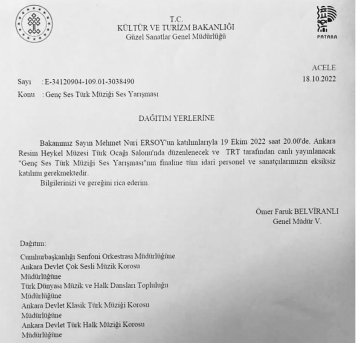 "Bakanımız Sayın Mehmet Nuri Ersoy'un katılımlarıyla 19 Ekim 2022 saat 20.00'de, Ankara Resim Heykel Müzesi Türk Ocağı Salonu'nda düzenlenecek ve TRT tarafından canlı yayınlanacak "Genç Ses Türk Müziği Ses Yarışması"nın finaline tüm idari personel ve sanatçılamızın eksiksiz katılımı gerekmektedir.