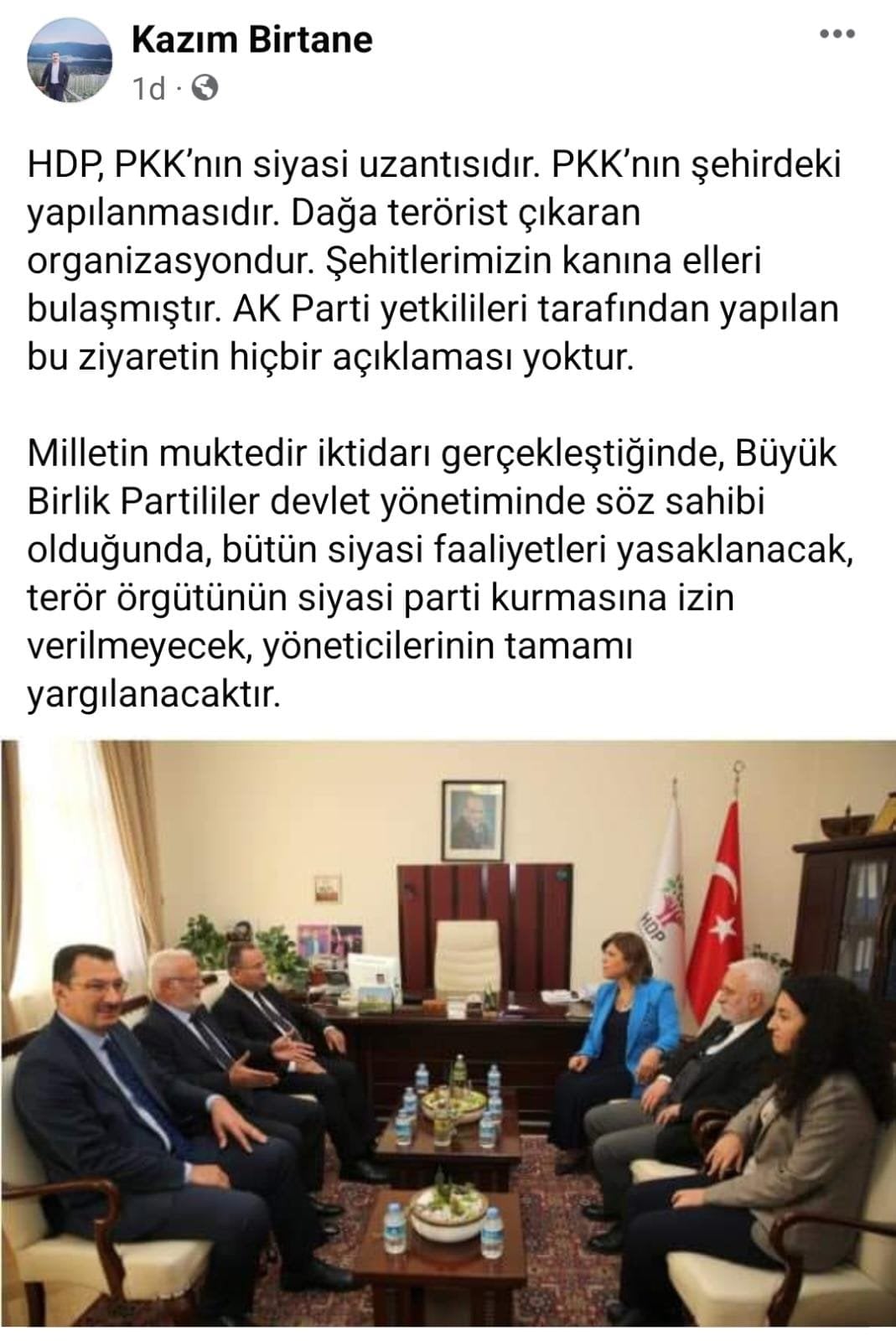 AKP’lilerin HDP’lilere yaptığı ziyarete ilişkin fotoğrafı sosyal medya hesabından paylaşan BBP MKYK Üyesi Kazım Birtane, duruma tepki gösterdi.
