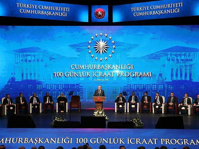 Burada sadece bazı başlıkları görsel malzeme eşliğinde ifade edeceğiz. Cumhurbaşkalığımıza ve bakanlıklarımıza bağlı kurumlarımızın 100 günde yaklaşık 46 milyar liralık bütçeyle hayata geçireceği bu 400 proje adete yeni dönemin ateşleyici gücü olacaktır. Mevcut bütçe imkanlarıyla yürütülebilmesine dikkat ettik. AK Parti iktidara geldiğinden beri bütçe disiplinine önem veren bir parti olmuştur. Önümüzdeki dönemde de inşallah aynen devam edeceğiz. Yeni yönetim mimarimizi oluştururken tüm kurumları, ilgili bakanlıklar bünyesinde toplamaya özen gösterdik. Genelkurmay, Diyanet, MİT, Savunma Sanayi gibi belli yerler dışındaki tüm kurumlar faaliyet alanlarındaki bakanlıklar bünyesinde çalışmalarını sürdürecek.