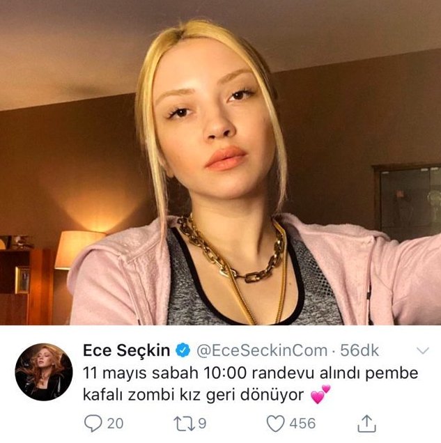 Cumhurbaşkanı Erdoğan'ın bu kararı açıklamasının ardından ünlü şarkıcı Ece Seçkin, Instagram hesabından bir paylaşımda bulundu. Ece Seçkin paylaşımında, "11 Mayıs sabah 10.00'a randevu alındı. Pembe kafalı zombi kız geri dönüyor" ifadelerini kullandı.