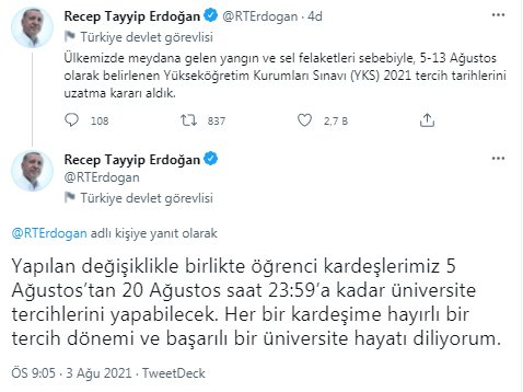 Yeni tercih tarihlerini de duyuran Cumhurbaşkanı Erdoğan, "Yapılan değişiklikle birlikte öğrenci kardeşlerimiz 5 Ağustos’tan 20 Ağustos saat 23:59’a kadar üniversite tercihlerini yapabilecek. Her bir kardeşime hayırlı bir tercih dönemi ve başarılı bir üniversite hayatı diliyorum" ifadelerini kullandı.