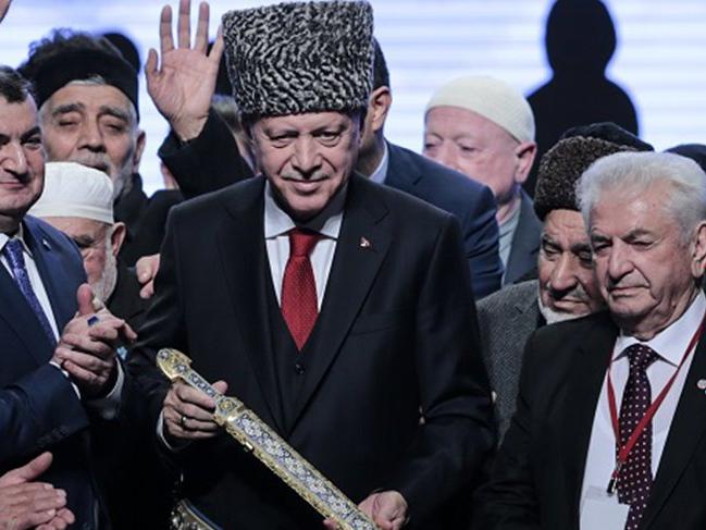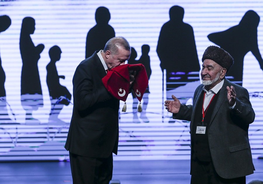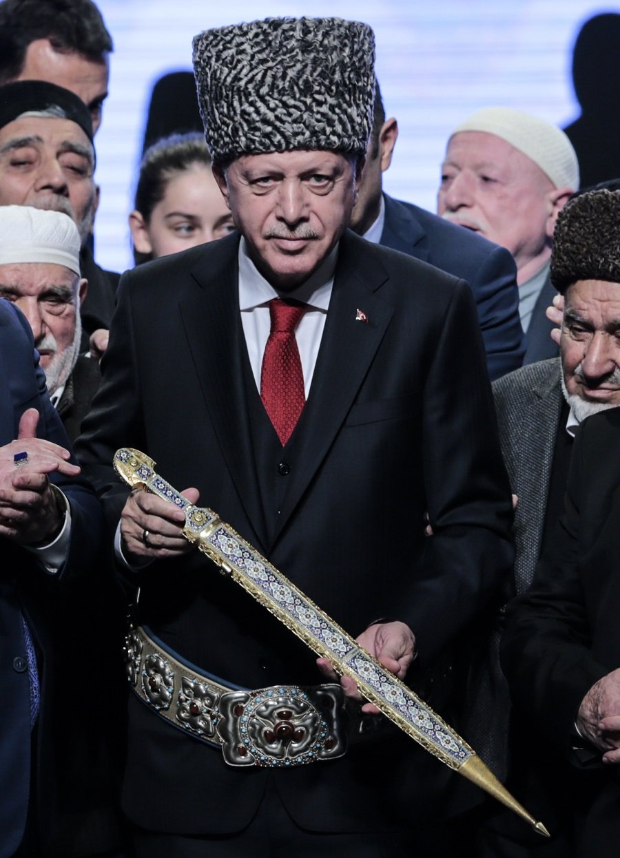 Cumhurbaşkanı Erdoğan'a kalpak, kılıç ve kemerden oluşan takım takdim edildi.Ahıska Türklerinin sürgüne gönderilmelerinin 75'inci yılını üzüntüyle yad ettiklerini dile getiren Cumhurbaşkanı Erdoğan, "Bugün aramızda 1944 yılındaki sürgünü bizzat yaşayan ak saçlılarımız var. Bugün bu salonda tam 75 senedir yüreği vatan hasreti ile kavrulan, gözyaşı döken Ahıskalı kardeşlerimiz var" dedi.