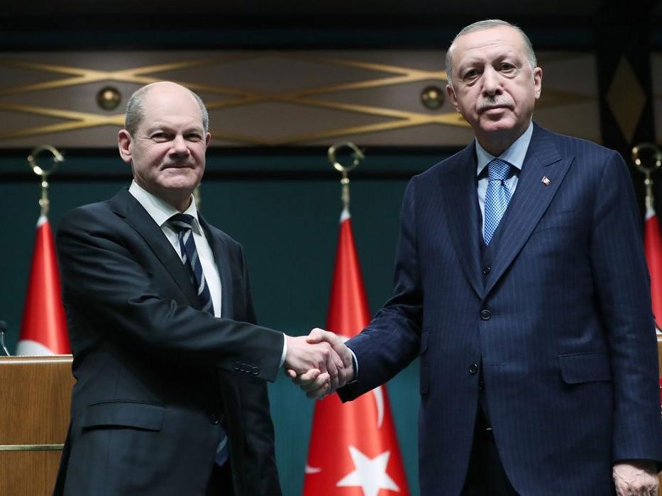 Cumhurbaşkanı Erdoğan ve Almanya Başbakanı Scholz, görüşmede Rusya-Ukrayna savaşındaki son gelişmeleri de değerlendirdi. (AA)