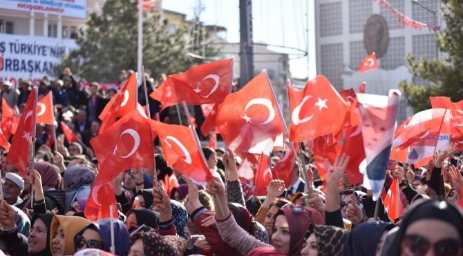 Doğu ve Güneydoğdu'daki operasyonları hatırlatan Erdoğan, “Tek millet, tüm etnik unsurlarıyla, Kürdüyle, Arabıyla, Çerkesiyle, Gürcüsüyle, Lazıyla, Romanıyla, velhasıl tek millet. İki, tek bayrak. Bayrağımızın dışında bir bayrak asla kabul etmiyoruz. Karşımıza paçavralarla çıkanlara gerekli cevabı bu milletimiz askeriyle, polisiyle, korucusuyla verdi veriyor. Tek vatan, 780 bin kilometrekareyle tek vatan. Bu vatanı bölmek, parçalanmak isteyenlere şu anda yapılan operasyonları izliyoruz değil mi. Gerekli cevabı veriyor muyuz? Ne dedik taa çözüm sürecinden önce. 'Bak akıllı ol, yanlış yapmayın, eğer yanlış yapacak olursanız size bu işi dar ederiz.' Şu anda sabır sabır ne yaptılar, benim Kürt kardeşlerimi sokağa döktüler. Bir tane eşbaşkan çıkmış, ne diyor, 'dökülün sokağa' ve 52 tane orada vatandaşımız öldü. Ölen Kürt, öldüren Kürt. Hani sen Kürtlerin temsilcisiydin, ya nasıl temsilcilik bu, yalan" dedi.