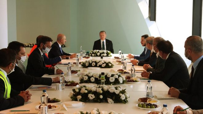 Cumhurbaşkanı Erdoğan'a, Ulaştırma ve Altyapı Bakanı Adil Karaismailoğlu, Hazine ve Maliye Bakanı Berat Albayrak, İletişim Başkanı Fahrettin Altun, Üsküdar Belediye Başkanı Hilmi Türkmen ile AKP İstanbul İl Başkanı Bayram Şenocak da eşlik etti. (İHA)