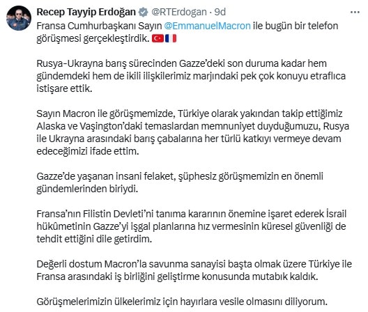 Görüşmede Gazze'deki durumun önemine dikkat çeken Erdoğan, Fransa’nın Filistin Devleti’ni tanıma kararını önemsediğini ifade ederek, “İsrail hükümetinin Gazze’yi işgal planları yalnızca bölgesel değil, küresel güvenlik açısından da ciddi bir tehdit oluşturuyor” dedi.