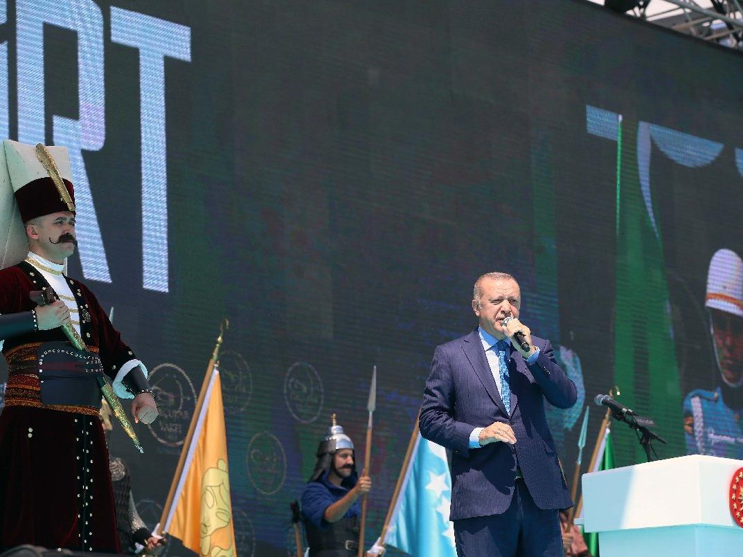 Darbe girişimi sırasında, ülkeyi işgale yeltenen FETÖ'cü hainlerin, hayatları dahil her şeylerinden vazgeçen bir milleti ve onun temsilcilerini Malazgirt Ovası'nda olduğu gibi karşılarında bulduklarını ifade eden Erdoğan, şunları söyledi: