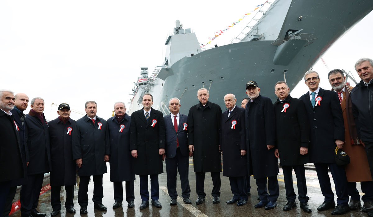 Cumhurbaşkanı ve AKP Genel Başkanı Recep Tayyip Erdoğan, Tuzla TCG Anadolu Gemisi Teslim Töreni ve Yeni MİLGEM Fırkateynleri Sac Kesme Töreni'ne katıldı. Törene Erdoğan’ın yanı sıra MHP lideri Devlet Bahçeli, HÜDA-PAR Genel Başkanı Zekeriya Yapıcıoğlu, DSP Genel Başkanı Önder Aksakal, Büyük Birlik Partisi Genel Başkanı Mustafa Destici ve Yeniden Refah Partisi Genel Başkanı Fatih Erbakan da katıldı.*Hizmete aldığımız TCG Anadolu en büyük ve en ağır helikopterler ile insansız hava araçlarının iniş kalkış yapabileceği kendi alanında dünyanın ilk savaş gemisidir.