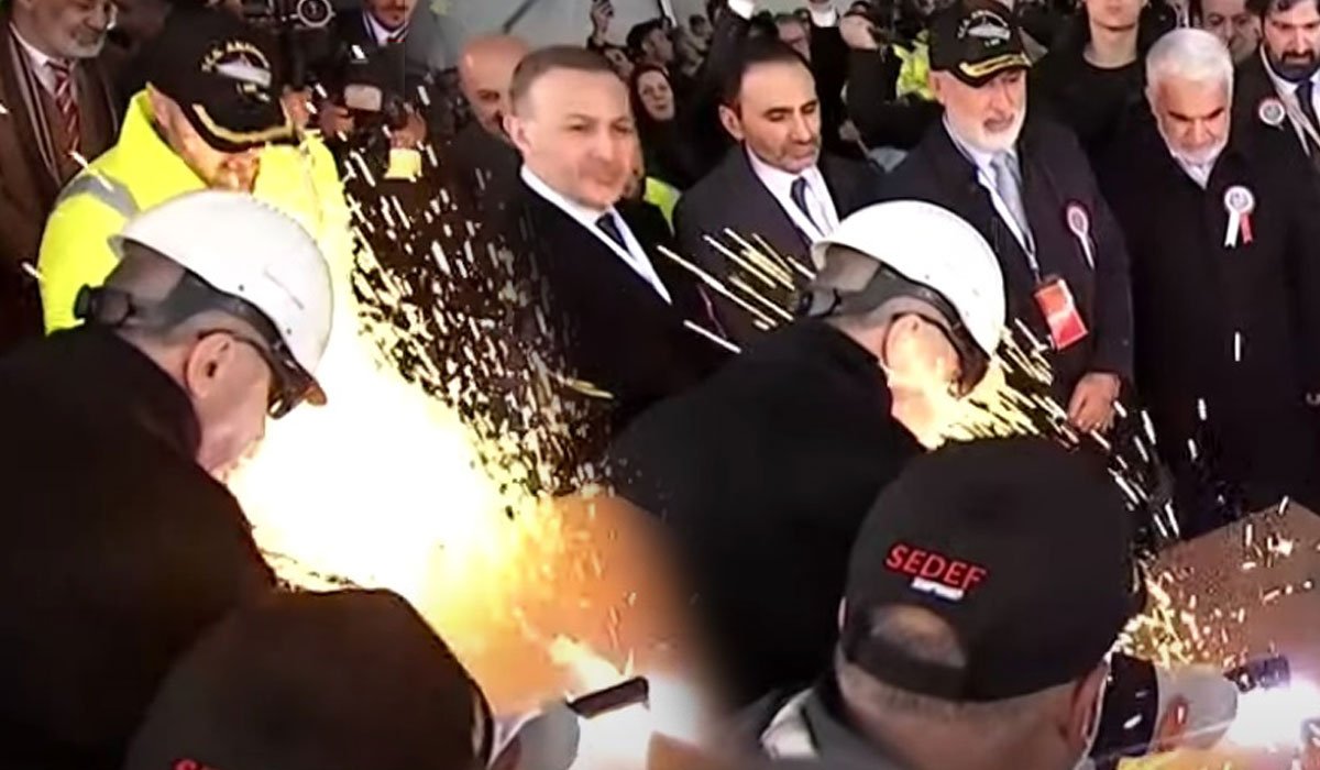 Konuşmaların ardından sac kesim törenine geçildi. Özel gözlük takan Erdoğan'ın yüzüne sac kesimi sırasında kıvılcımlar sıçradı.