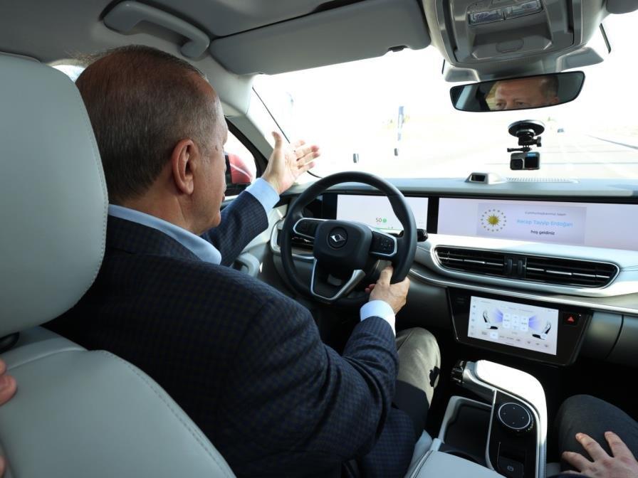 Törenin ardından Erdoğan, Türkiye'nin yerli otomobili TOGG'un direksiyonuna geçti. Bilişim Vadisi'nde aracı kullanan Cumhurbaşkanı Erdoğan'a TOGG CEO'su Gürcan Karakaş, Türkiye Odalar ve Borsalar Birliği Başkanı Rifat Hisarcıklıoğlu eşlik etti. (İHA)