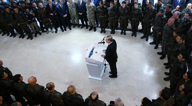 Foto: DHABurada Cumhurbaşkanı'na ziyaret anısına tablo hediye edildi. Daha sonra komutanlık bünyesinde kullanılan askeri malzemelerin tek tek gösterilmesi ve anlatılmasının ardından Cumhurbaşkanı askerlere hitap etti.
