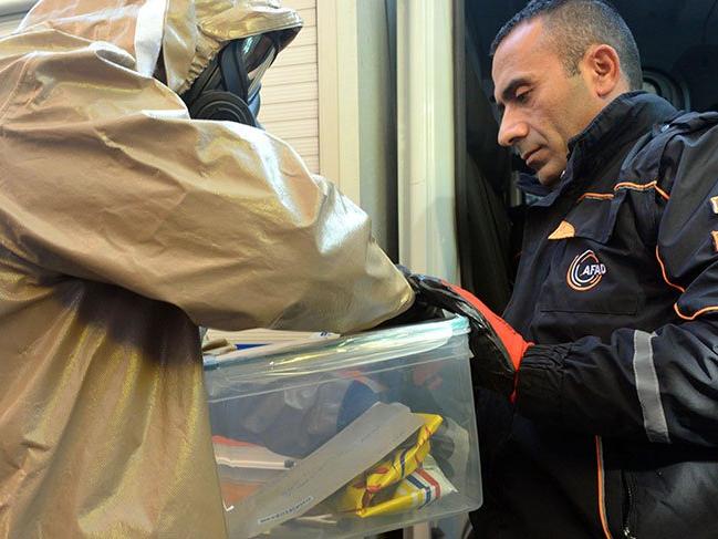 Cumhurbaşkanı Erdoğan'a gönderilmek üzere PTT'ye bırakılan zarfın üzerinki 'siyanür içilecek' yazısını gören çalışanlar durumu hemen AFAD'a bildirip, şubedeki diğer vatandaşlar da dışarı çıkardı Foto: DHAİhbar üzerine PTT'ye gelen AFAD ekipleri, özel kıyafetlerle şubeye geçti. İlk olarak zarfta cihazlarla siyanür taraması yapıldı ve siyanüre rastlanmadı.