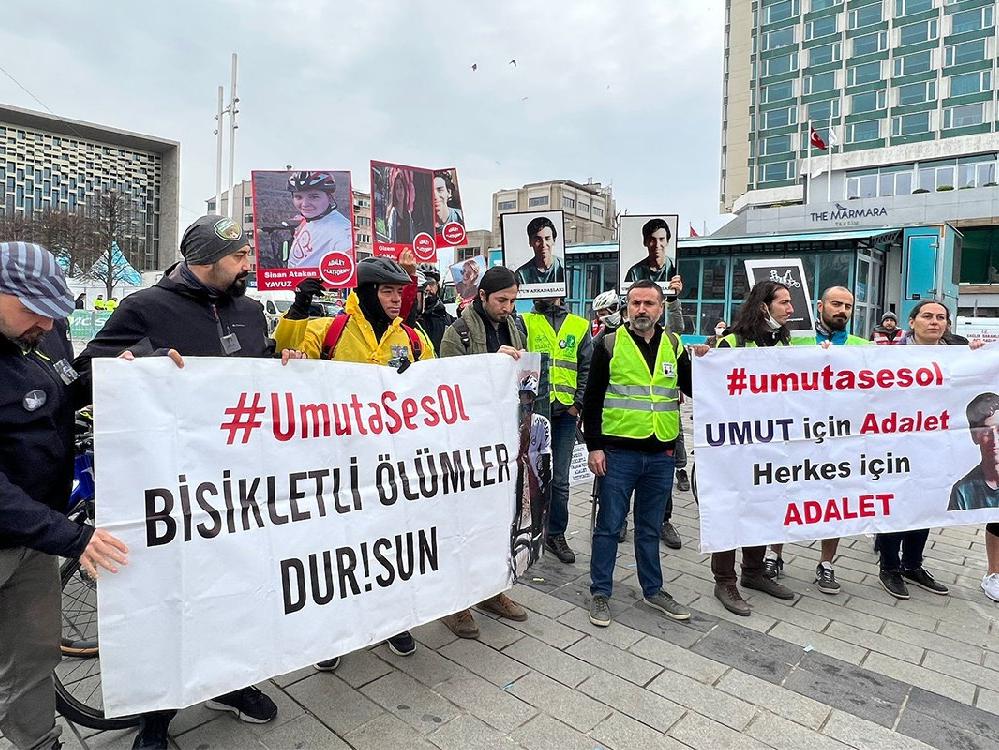Taksim Meydanı'ndaki eylemde ‘Umut İçin Adalet, Herkes İçin Adalet’, ‘Bisikletli Ölümler Dursun’ yazılı pankartlar açıldı.