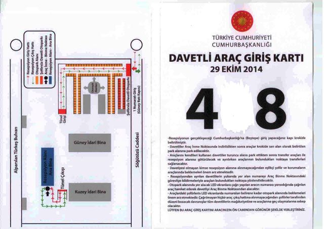 Yani Erdoğan cumhurbaşkanı olarak bu yıl 29 Ekim'de Atatürk Orman Çiftliği yerleşkesinde kendisi için inşa edilen Ak Saray'da resepsiyon verecek. Erdoğan'ın ilk kez kullanmaya başlayacağı Ak Saray'daki resepsiyon için yoğun güvenlik önlemleri alınırken, davetlilere de talimatlardan oluşan bir araç giriş kartı gönderildi.