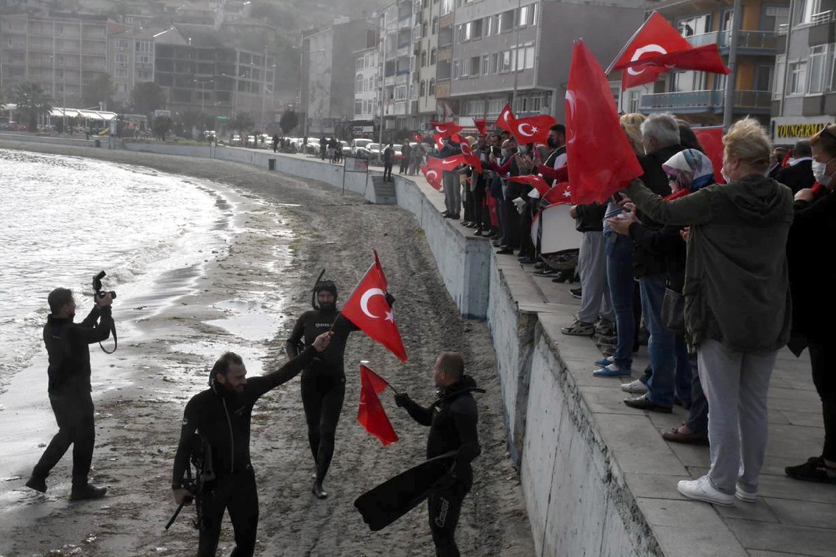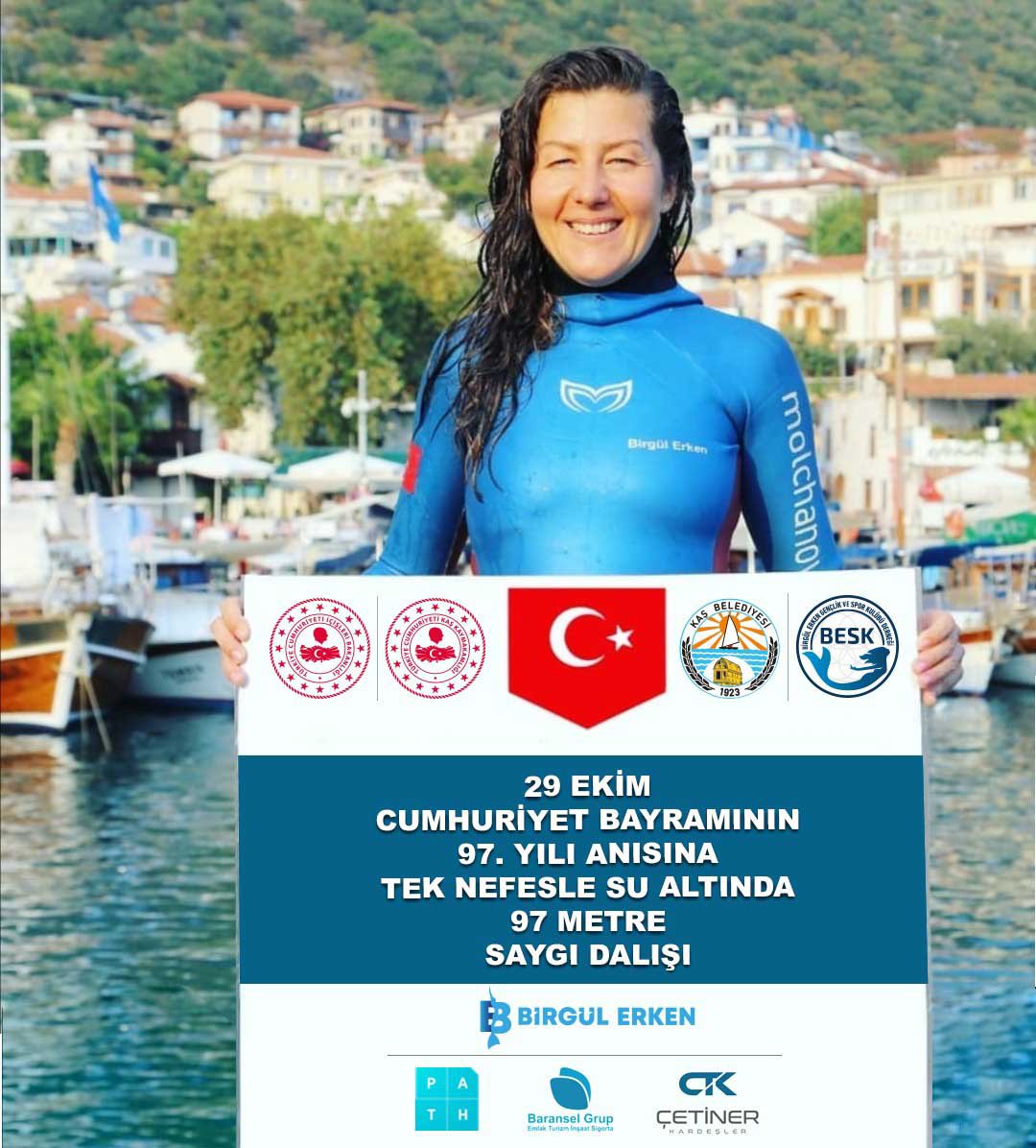 Antalya Demre'de Birgül Erken, Cumhuriyet'in 97. Yılı anısına tek nefeste 97 metre saygı dalışı gerçekleştirdi.
