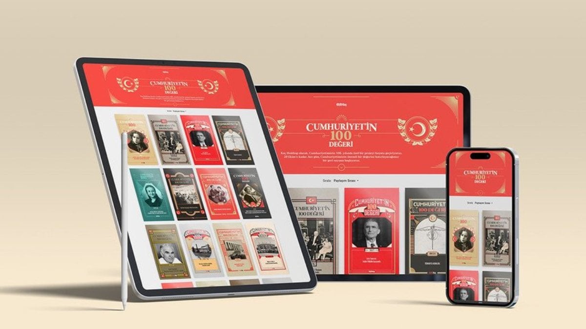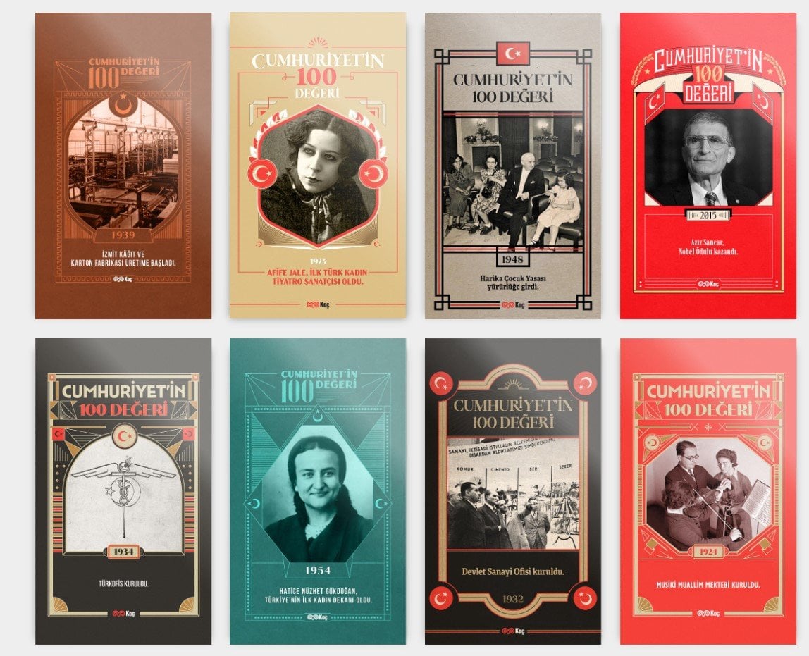 Milli kütüphanenin kurulmasından İstanbul Radyosu’nun yaptığı ilk yayına, onuncu yıl marşının bestelenmesinden Türkiye Cumhuriyeti’nin ilk kadın muhtarı Gül Esin Hanım’ın hikâyesine kadar 100 farklı değer, Koç Holding’in ve Koç Topluluğu markalarının sosyal medya hesapları üzerinden takip edilebiliyor.