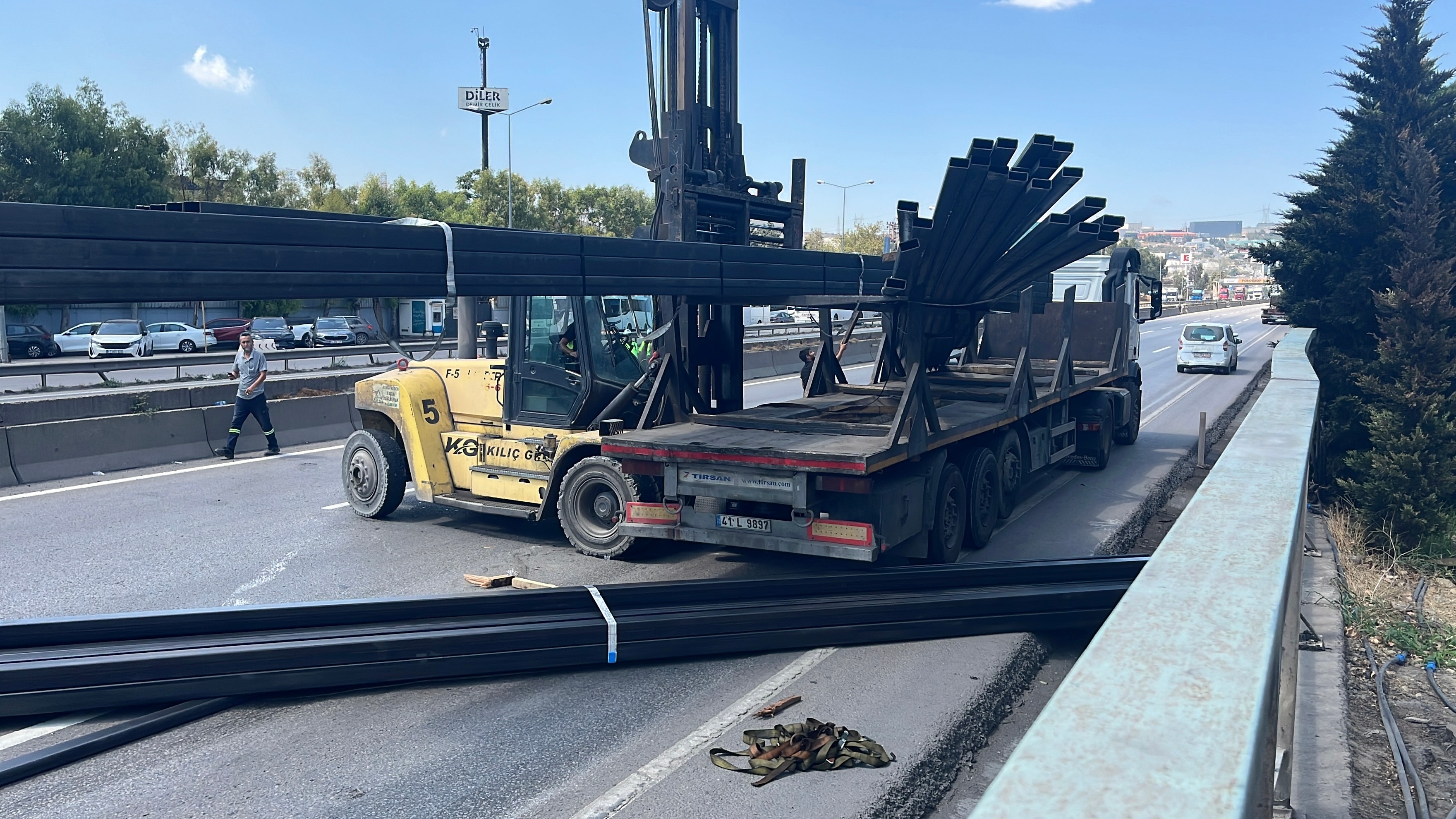 Kocaeli’nin Dilovası ilçesinde D-100 kara yolunda İstanbul yönüne ilerleyen Hüseyin Ç. idaresindeki TIR’ın dorsesindeki demir profiller, güvenlik halatının kopması sonucu yola saçıldı.
