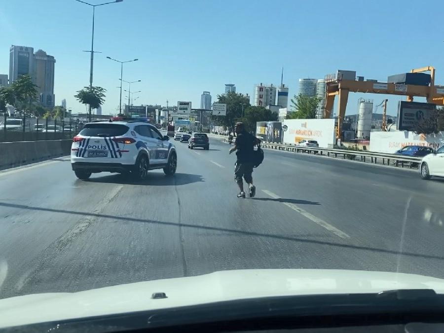Hızla geçen araçların arasından koşup, karayolunu birbirine katan eli bıçaklı saldırgan, polisi alarma geçirdi.