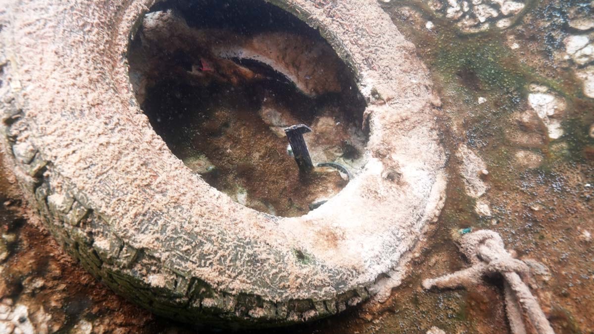 Gölde dip temizliği yapan dalgıçlar, topladıkları otomobil lastiği, teneke kutu, plastik ve cam şişe gibi atıkları kıyıya çıkardı.
