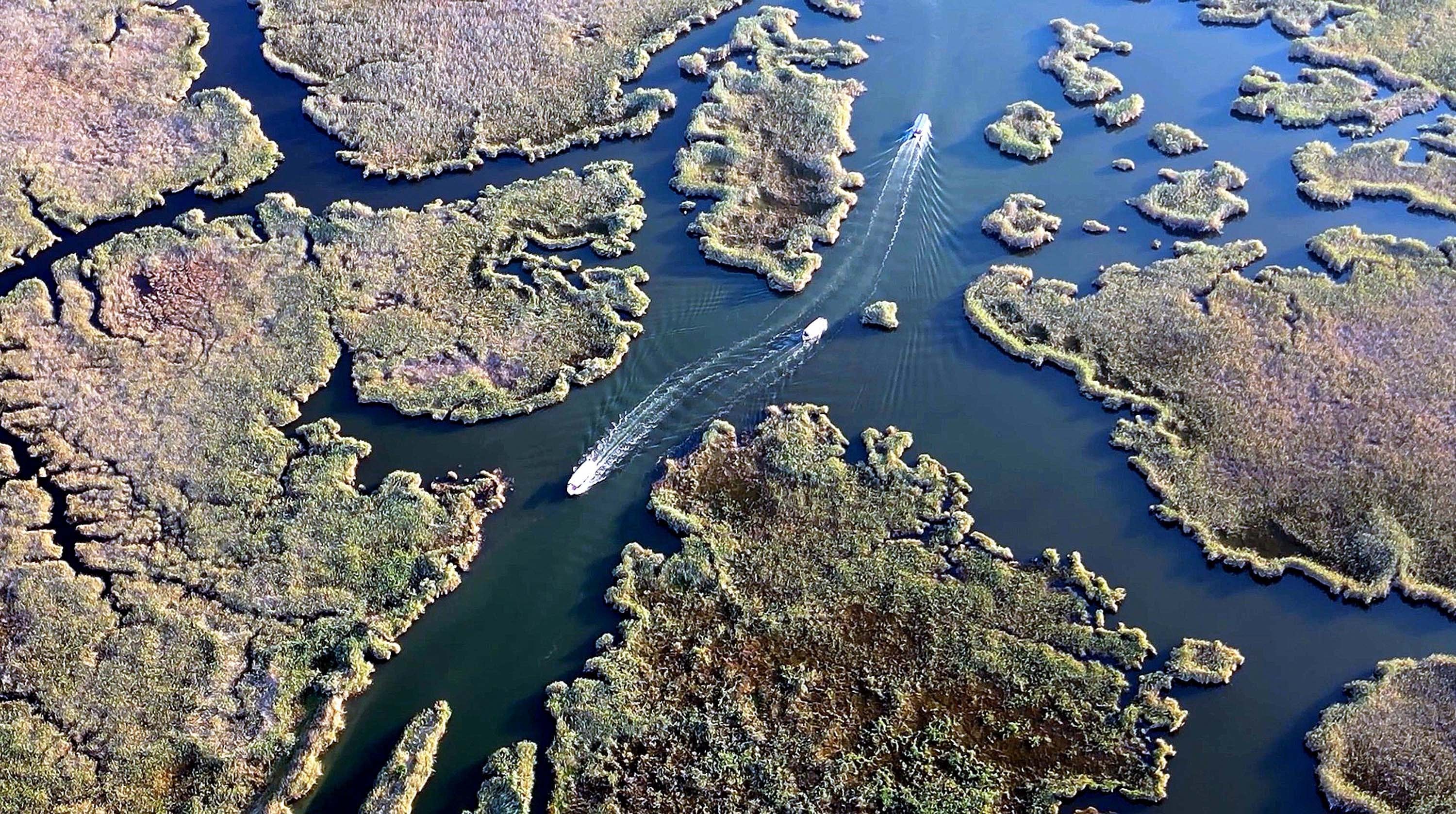 Havadan dronla görüntülenen Dalyan Kanalı, labirent görünümlü sazlıkları ile de dikkat çekiyor.
