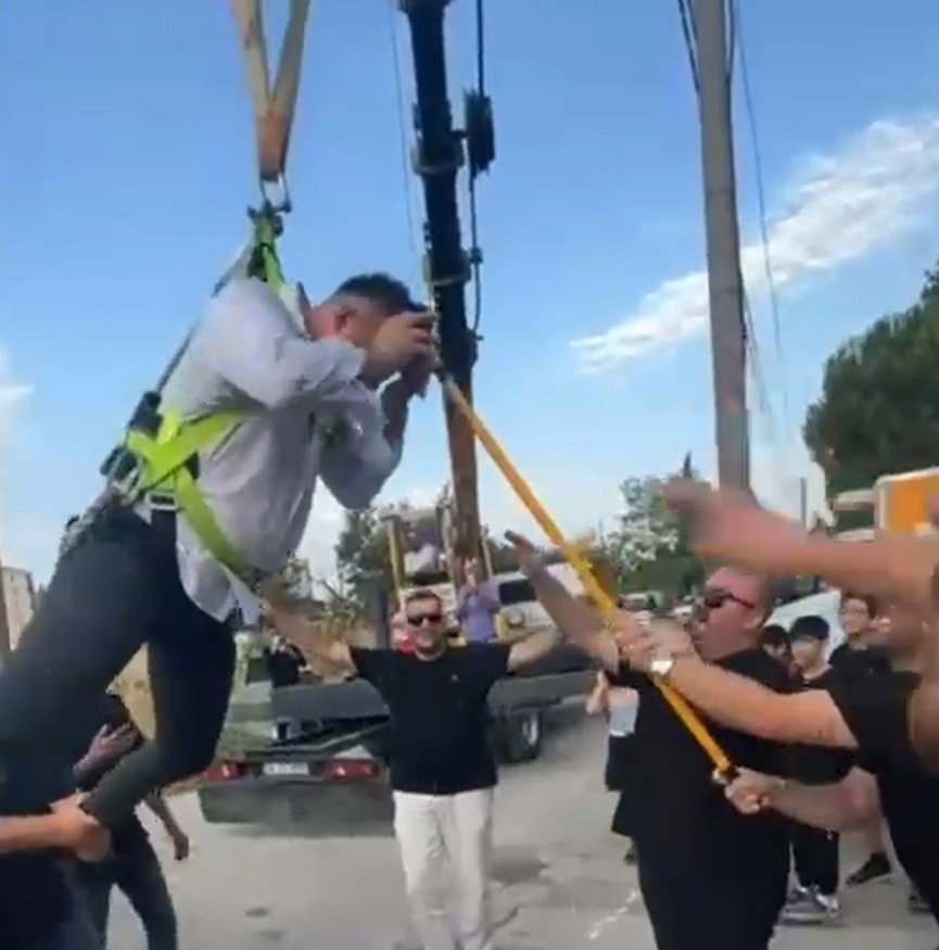 Düğün öncesi geleneksel “damat eğlencesi”ni farklı bir boyuta taşıyan Uysal’ın arkadaşları, genç damadı kiralanan vinç yardımıyla havaya kaldırdı. Yüksekte asılı kalan Uysal, müzik eşliğinde dans eden arkadaşlarına havadan eşlik etti.