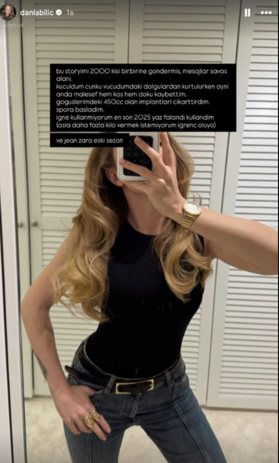 "Bu storymi 2000 kişi birbirine göndermiş, mesajlar savaş alanı. Küçüldüm çünkü vücudumdaki dolguları temizletirken maalesef aynı anda hem kas hem doku kaybettim. Göğüslerimdeki 450 cc’lik implantları çıkarttırdım. Spora başladım. Zayıflama iğnesi kullanmıyorum, en son 2025 yazında kullanmıştım. Zaten daha fazla kilo vermek de istemiyorum."