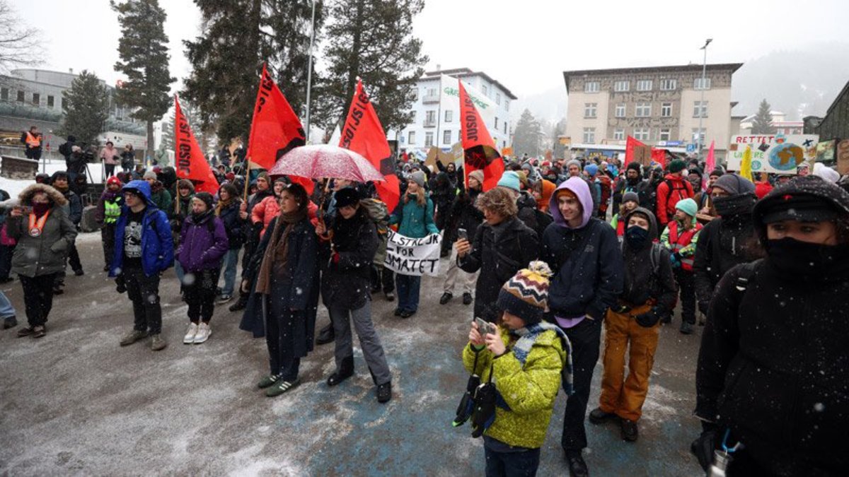 Davos'taki Postane Meydanı'nda düzenlenen protestolara, çok sayıda çevreci katıldı. Ellerinde WEF ve iklim değişikliğine yönelik farklı dillerde eleştirel pankart ile dövizler taşıyan çevreciler, bu konuda adım atmayan hükümetleri eleştirdi.