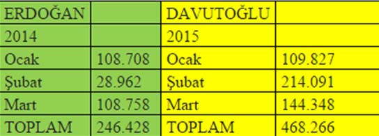 Davutoğlu ile Erdoğan’ın harcamaları kıyaslandığında geçen yılın ilk üç ayı ile bu yılın ilk üç ayında yapılan harcama arasında büyük bir fark yaşandı. Erdoğan’ın Başbakan olduğu dönemde 2014’ün ilk üç ayında harcanan tutar 246 milyon 428 bin lira oldu. Davutoğlu ise bu yılın aynı döneminde 468 milyon 266 bin lira harcadı. Böylece iki dönem arasındaki fark yüzde 90’nı buldu.