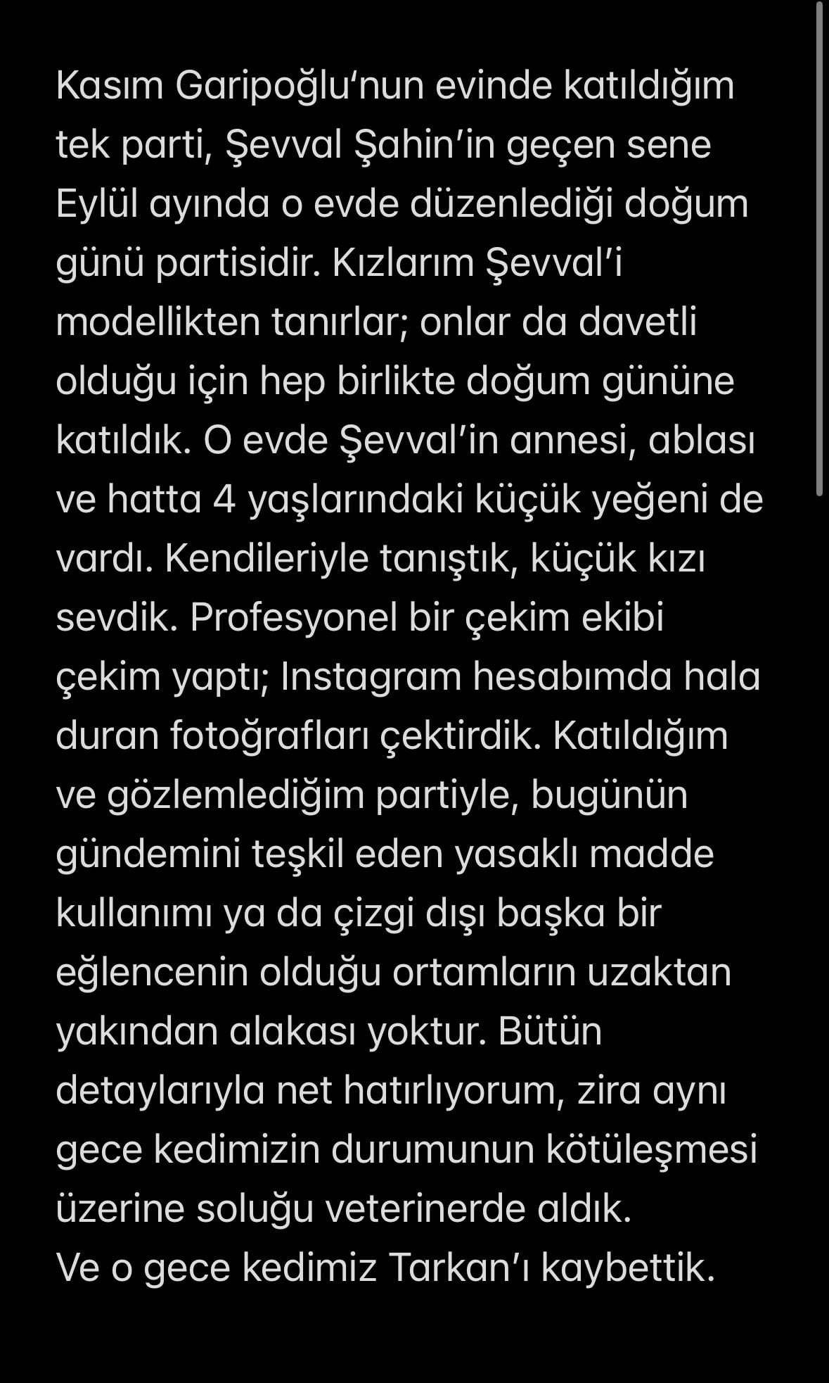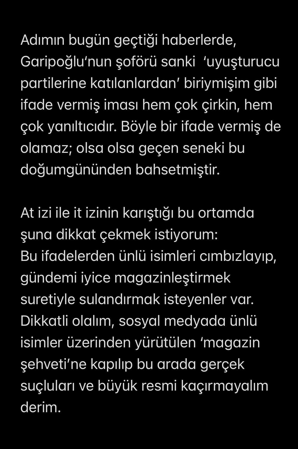 "Adımın bugün geçtiği haberlerde, Garipoğlu’nun şoförü sanki “uyuşturucu partilerine katılanlardan” biriymişim gibi ifade vermiş iması hem çok çirkin, hem çok yanıltıcıdır. Böyle bir ifade vermiş de olamaz; olsa olsa geçen seneki bu doğum gününden bahsetmiştir.