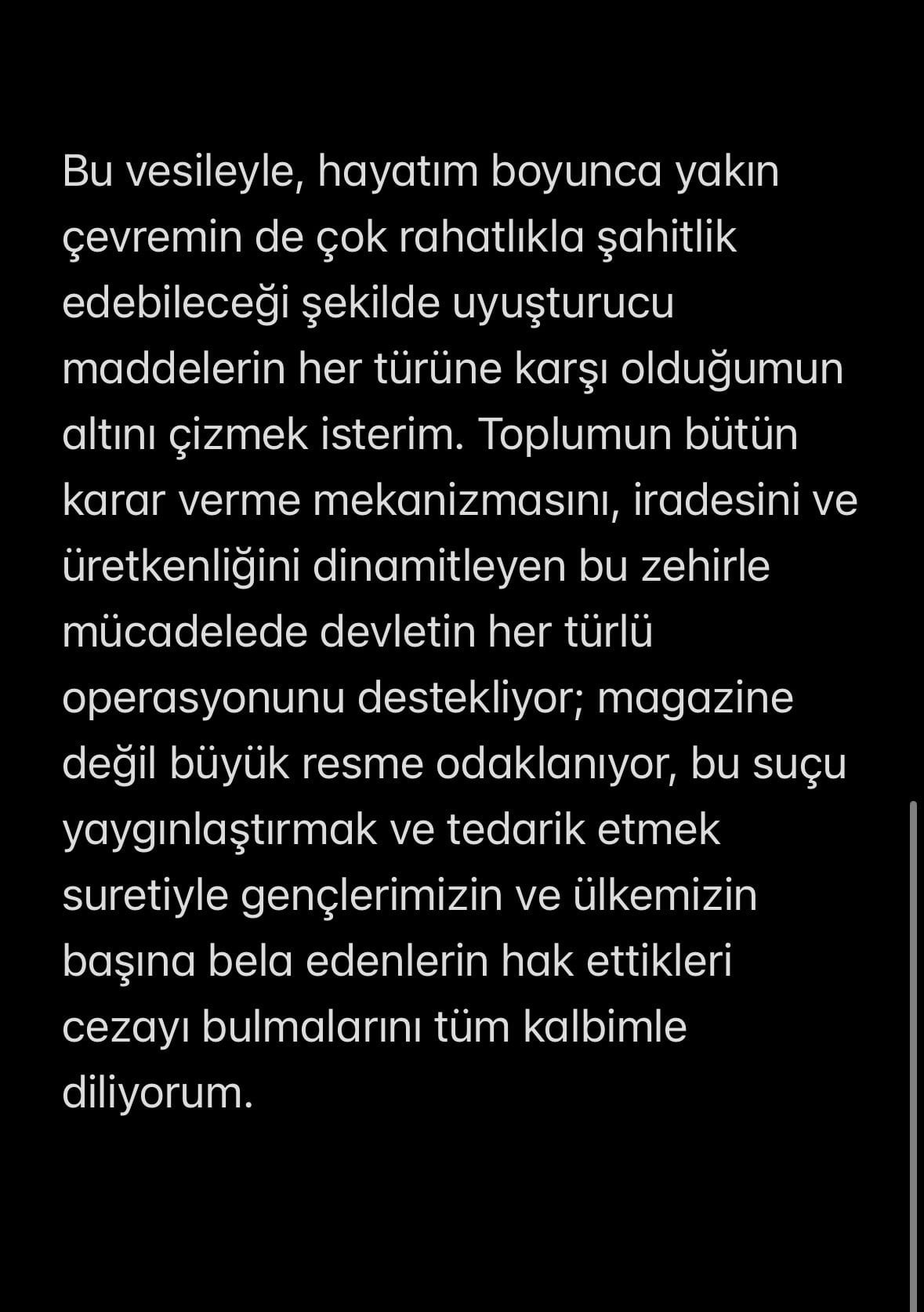 Toplumun bütün karar verme mekanizmasını, iradesini ve üretkenliğini dinamitleyen bu zehirle mücadelede devletin her türlü operasyonunu destekliyor; magazine değil büyük resme odaklanıyor, bu suçu yaygınlaştırmak ve tedarik etmek suretiyle gençlerimizin ve ülkemizin başına bela edenlerin hak ettikleri cezayı bulmalarını tüm kalbimle diliyorum."