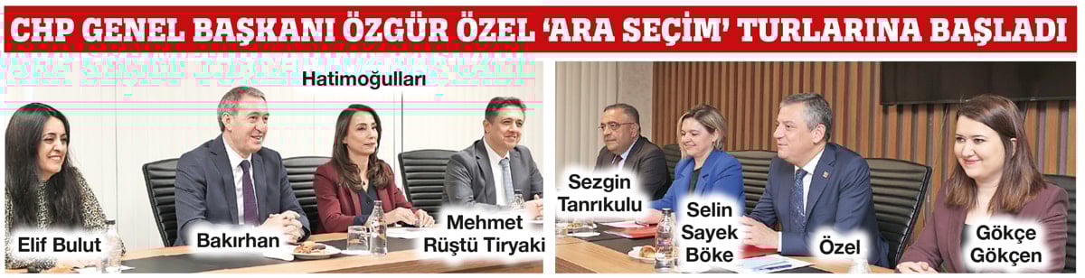 CHP lideri Özgür Özel, ara seçim çağrısının ardından muhalefet parti turuna başladı. Özel ilk olarak dün DEM Parti Eş Genel Başkanları Tülay Hatimoğulları ve Tuncer Bakırhan ile bir araya geldi. Özel, sekiz milletvekilliği koltuğunun boş olması nedeniyle TBMM Başkanlığı’nın bir an önce ara seçime gitmesi gerektiğini dile getirdi. Özel, “Bir an önce Meclis’in boşalan sandalyeler için ara seçim kararı alması, bu konuda da Meclis Başkanı’nın üzerine düşen görevi yapması zorunludur. Olmazsa iktidar seçimden kaçma sorumluluğunu taşır” dedi. Hatimoğulları ise “Ara seçim yapılmalı” dedi.
