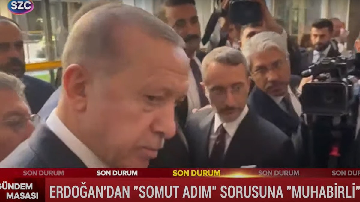 Grup toplantısı sonrası Erdoğan'a "Her türlü iş birliğine açığız dediniz ama DEM Partililer somut adım yok diyorlar. Somut adım olacak mı? Somut adım olabilir mi? Bekleyelim mi?" sorusu iletildi.
