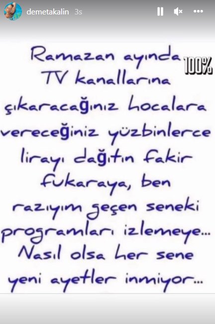 Şarkıcı Demet Akalın, Instagram hesabından "Ramazan ayında TV kanallarına çıkaracağınız hocalara vereceğiniz yüz binlerce lirayı fakir fukaraya dağıtın. Ben razıyım geçen seneki programları izlemeye. Nasıl olsa her sene yeni ayetler inmiyor" yazılı bir paylaşım yaptı.