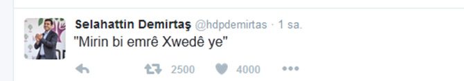 HDP Eş Genel Başkanı Selahattin Demirtaş, olayın ardından Twitter hesabında Kürtçe yaptığı paylaşımda, (Türkçe 'Ölüm Allah'ın emri') anlamına gelen Kürtçe, "Mirin bi emre Xwede ye" diye yazdı.