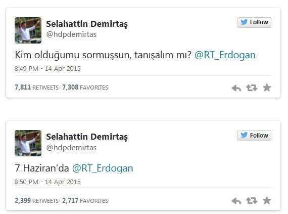 Demirtaş önce; "Kim olduğumu sormuşsun, tanışalım mı?" yazarken bundan hemen sonra da "7 Haziran'da" tweetini gönderdi. Bu tweetler sosyal medyada hızla yayıldı.