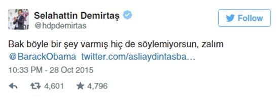 Twitter üzerinden Erdoğan’ın sözlerini paylaşan Demirtaş, Obama’ya seslenerek “Bak böyle bir şey varmış hiç de söylemiyorsun, zalım” ifadelerini kullandı.