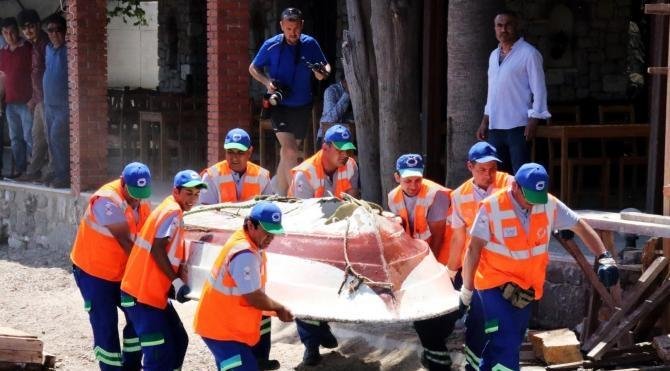 Çalışmalar sırasında bulunan batık bir sandal da sahile çıkarıldı. Sandal ve atık malzemeler, daha sonra temizlik görevlilerince Gölköy sahiline getirilerek sergilendi.