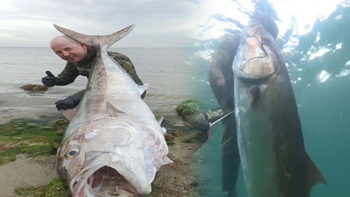 Zıpkınıyla 63 kilogram ağırlığında 1,8 metre boyunda akya balığı avlayan Doğan, o anları su altı kamerasıyla kaydetti.
