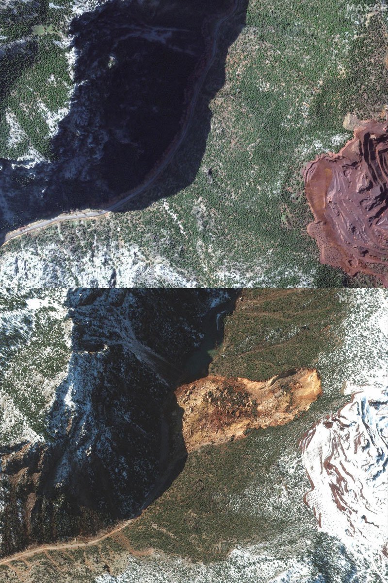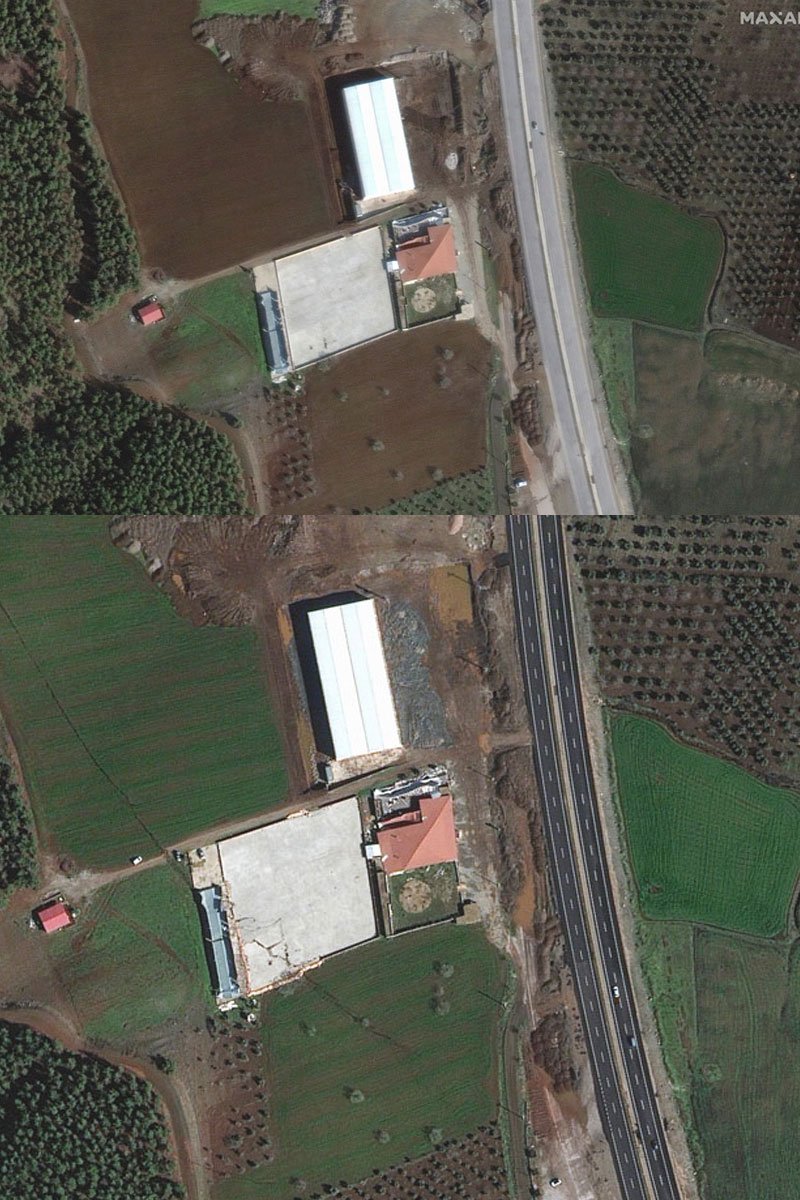 Gaziantep'in İzlahiye bölgesinde 27 Aralık 2022'de çekilen bir uydu görüntüsü ile depremden sonra çekilen bir fotoğraf, doğal afetin başka felaketleri de tetiklediği görülüyor.