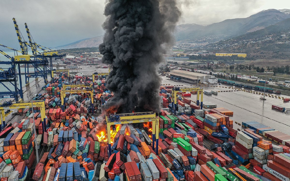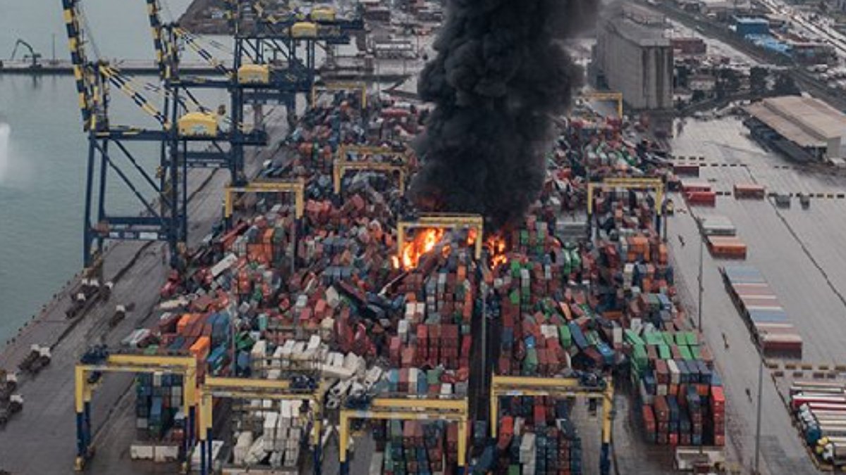 İskenderun Limanında depremin ardından devrilen konteynerlerde yangın çıktı.