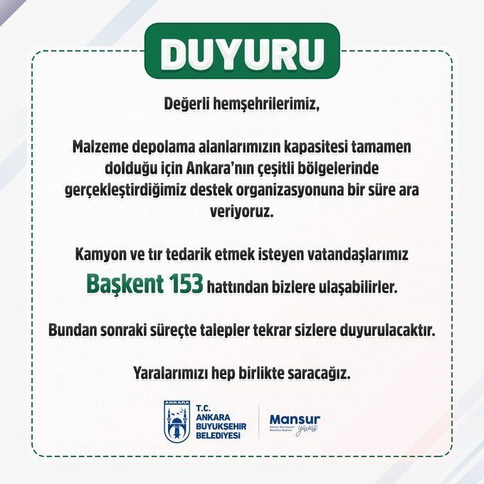 Malzeme yardımı yapan Ankara Büyükşehir Belediyesi kapasitenin tamamen dolması nedeniyle vatandaşlardan bir süre beklemelerini istedi.